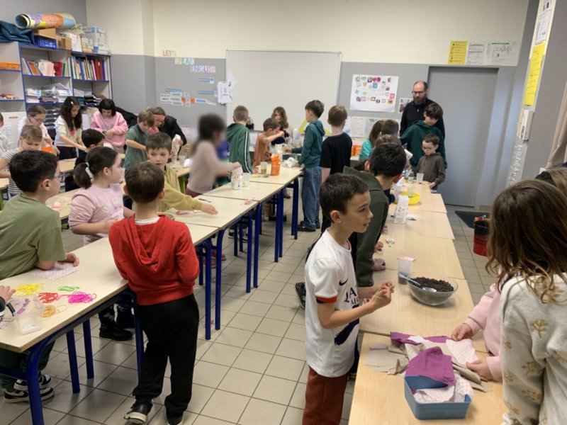 La petite usine composée des 43 élèves de CE et CM s’est donc investie pour préparer de magnifiques bocaux qui permettront aux acheteurs de faire de délicieux cookies.